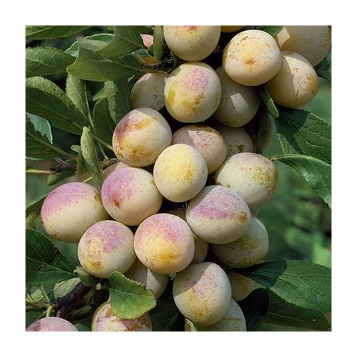 ‘De Nancy’ fruits beautiful red-flushed, yellow-orange plums which are sweet and juicy. Although primarily used in cooking, they are excellent fresh. Mirabelle plums are an important ingredient in French cuisine and can be used to make Tarte aux Mirabelles, among other dishes. The tree may need extra support under the fruit-bearing branches to avoid them breaking under the weight of the heavy crop.
