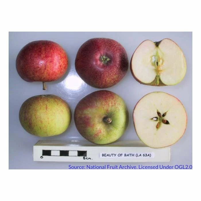 Beauty of Bath originated from the 19th Century as a local variety grown at Bailbrook, near Bath. It was introduced by the nurseryman George Cooling of Bath circa 1864. With attractive looking small to medium sized, flat round fruit, it is russeted with red flush and stripes over pale greenish yellow skin. Creamy white, soft, juicy flesh, sometimes stained pink under the skin. An excellent apple to have in any garden.